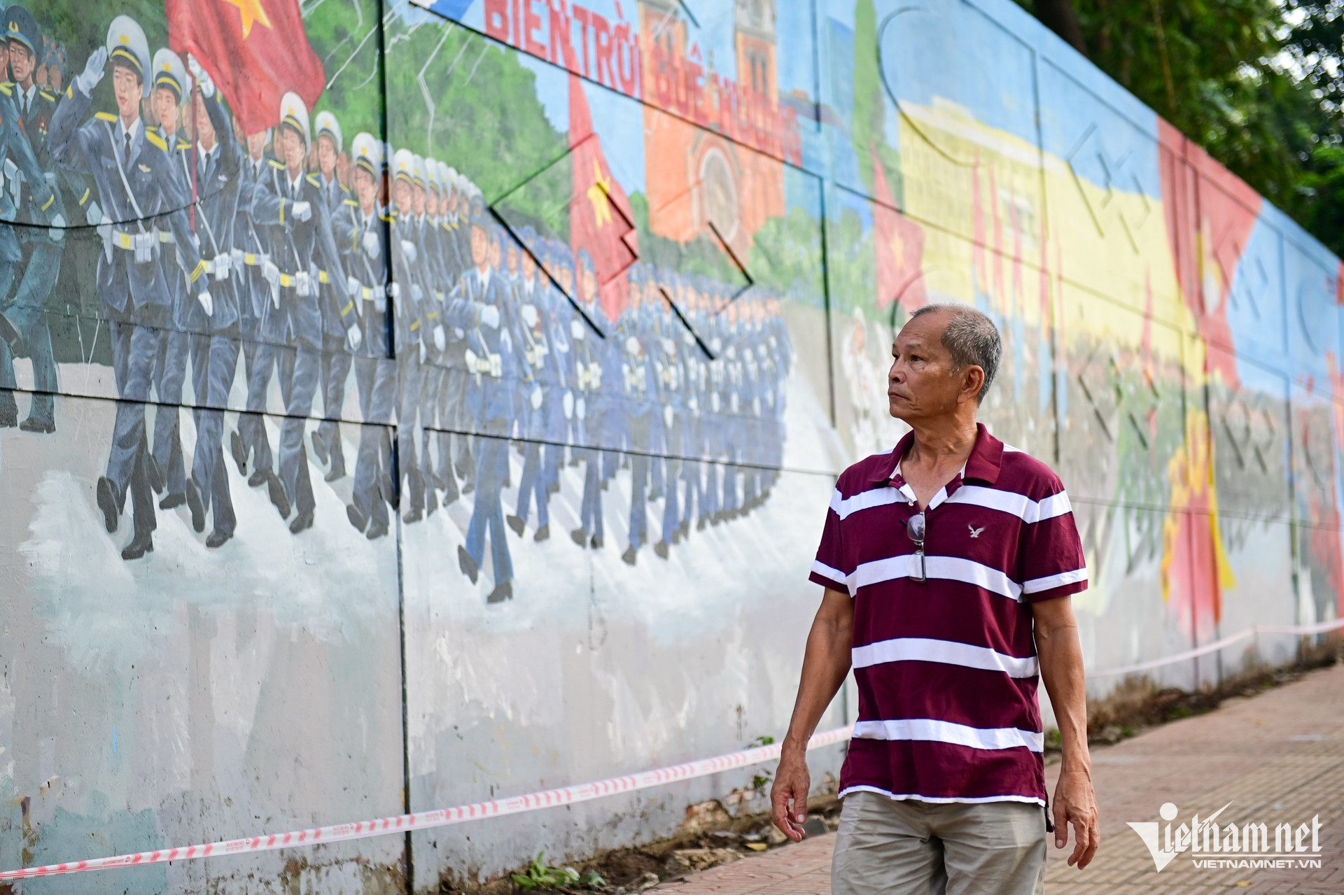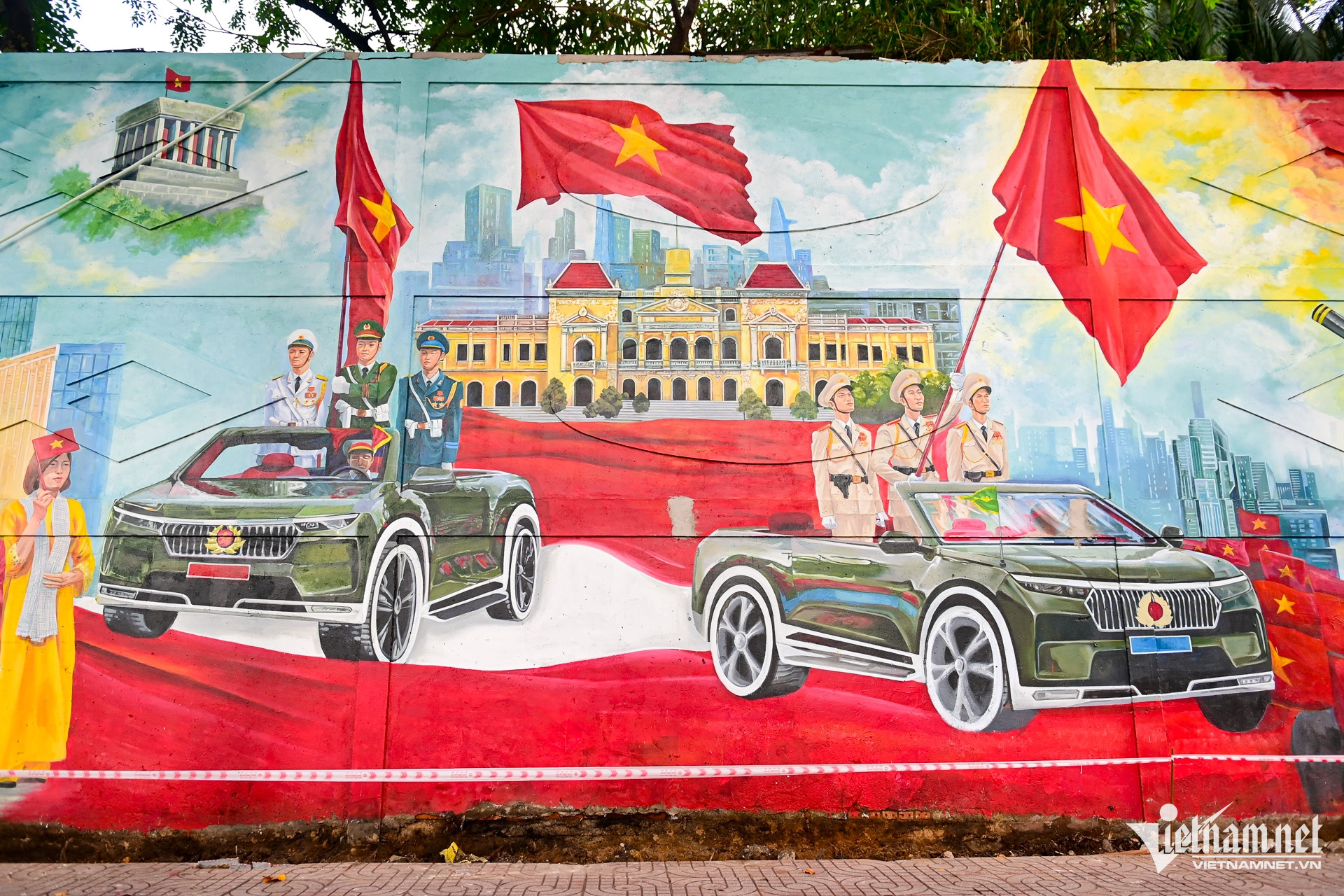 Dọc theo bức tường dài 300m trên đường Nguyễn Hữu Cảnh, đoạn gần Thảo Cầm Viên (phường Sài Gòn), loạt tranh bích họa tái hiện các khối diễu binh nối tiếp nhau, với hình ảnh xe quân sự, chiến sĩ, máy bay, pháo binh... được vẽ sống động trên mảng tường bê tông.