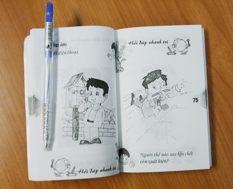 Cuốn "Hỏi đáp nhanh trí" được in làm 1.000 bản, dày khoảng 176 trang với 170 câu đố, đáp án, đi kèm cùng hình vẽ minh hoạ hoàn toàn màu đen trắng, giá bìa là 10.000 đồng. Tác giả cuốn sách này được ghi là Đức Trí (sưu tầm biên soạn).