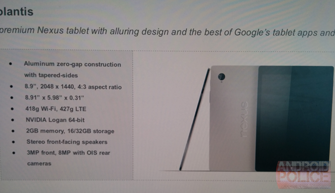 Người tiết lộ về Volantis có độ tin cậy cao đến nỗi Android Police không xem đây là tin đồn, đồng thời gần như chắc chắn đây sẽ là chiếc Nexus 9 (có thể tên gọi sẽ thay đổi khi máy chính thức được giới thiệu). Thiết bị này sử dụng tấm nền độ phân giải 2048 x 1440* (281ppi, tỉ lệ 4:3, không phải 16:9 như hầu hết tablet Android khác), vi xử lí NVIDIA Tegra K1 64-bit, RAM 2GB, bộ nhớ trong 16GB hoặc 32GB, camera chính 8 megapixel có chống rung quang học. Máy mỏng chỉ 7.9mm mà thôi.