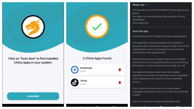 Mặc dù mô tả của ứng dụng trên Play Store khá thân thiện “được phát triển cho mục đích giáo dục, chỉ dùng để xác định nguồn gốc xuất xứ của một ứng dụng nhất định”. Nhưng trên thực tế, Remove China Apps chỉ quét những ứng dụng của Trung Quốc và sau đó có luôn tùy chọn gỡ bỏ.