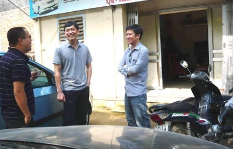 | Anh Thành (giữa) đang trao đổi với khách hàng có nhu cầu thuê xe |