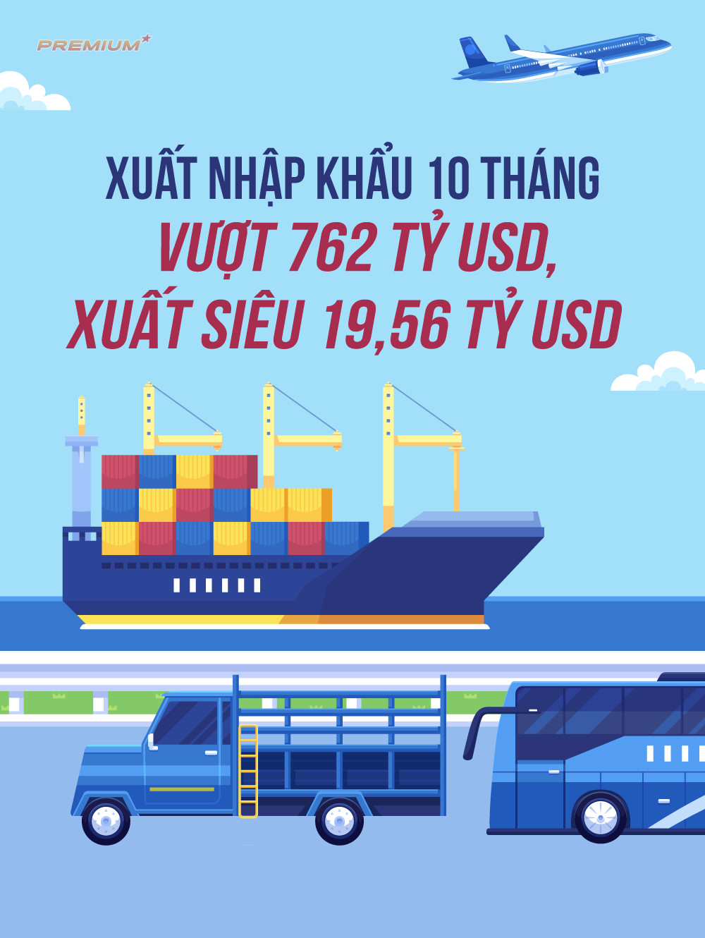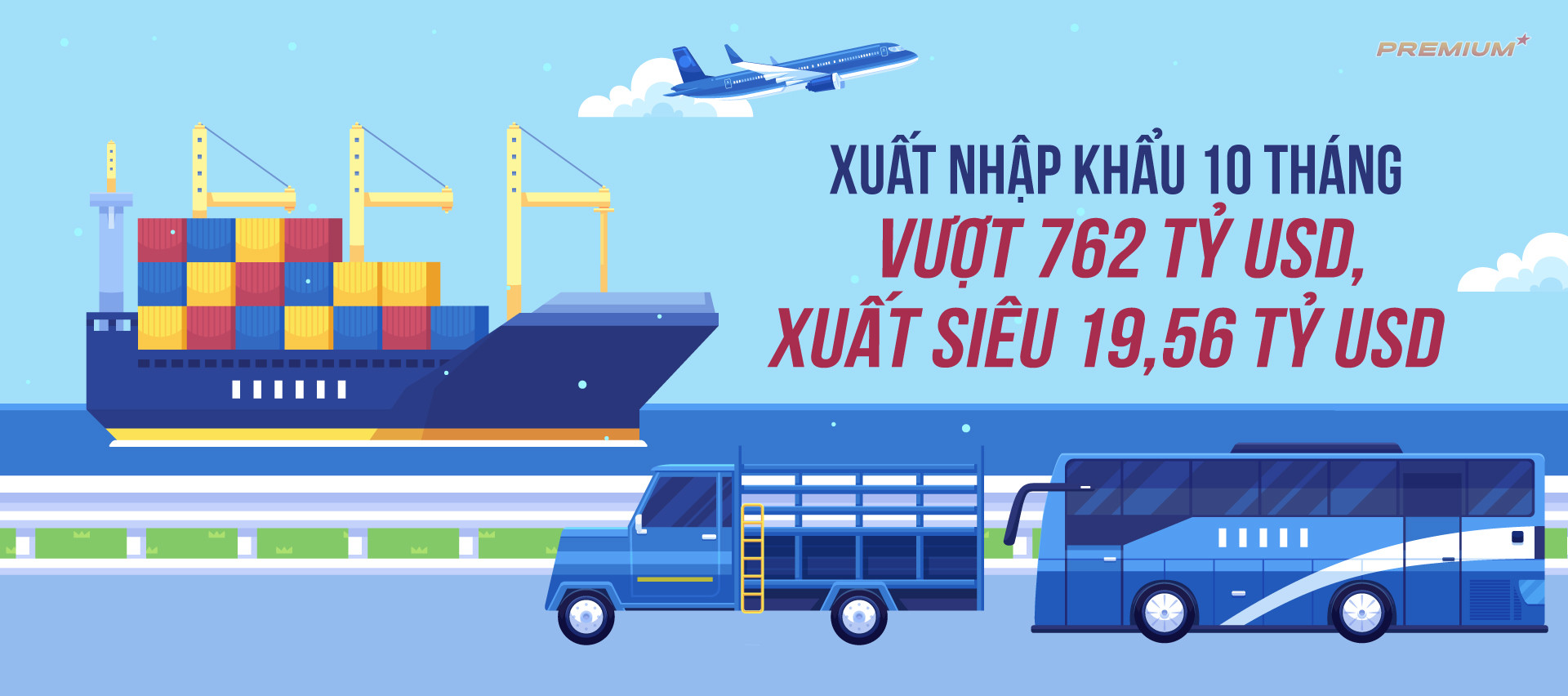 Tính chung 10 tháng năm nay, tổng kim ngạch xuất, nhập khẩu hàng hóa đạt 762,44 tỷ USD, tăng 17,4% so với cùng kỳ năm trước. Trong đó, xuất khẩu tăng 16,2%, nhập khẩu tăng 18,6%. Cán cân thương mại hàng hóa xuất siêu 19,56 tỷ USD.