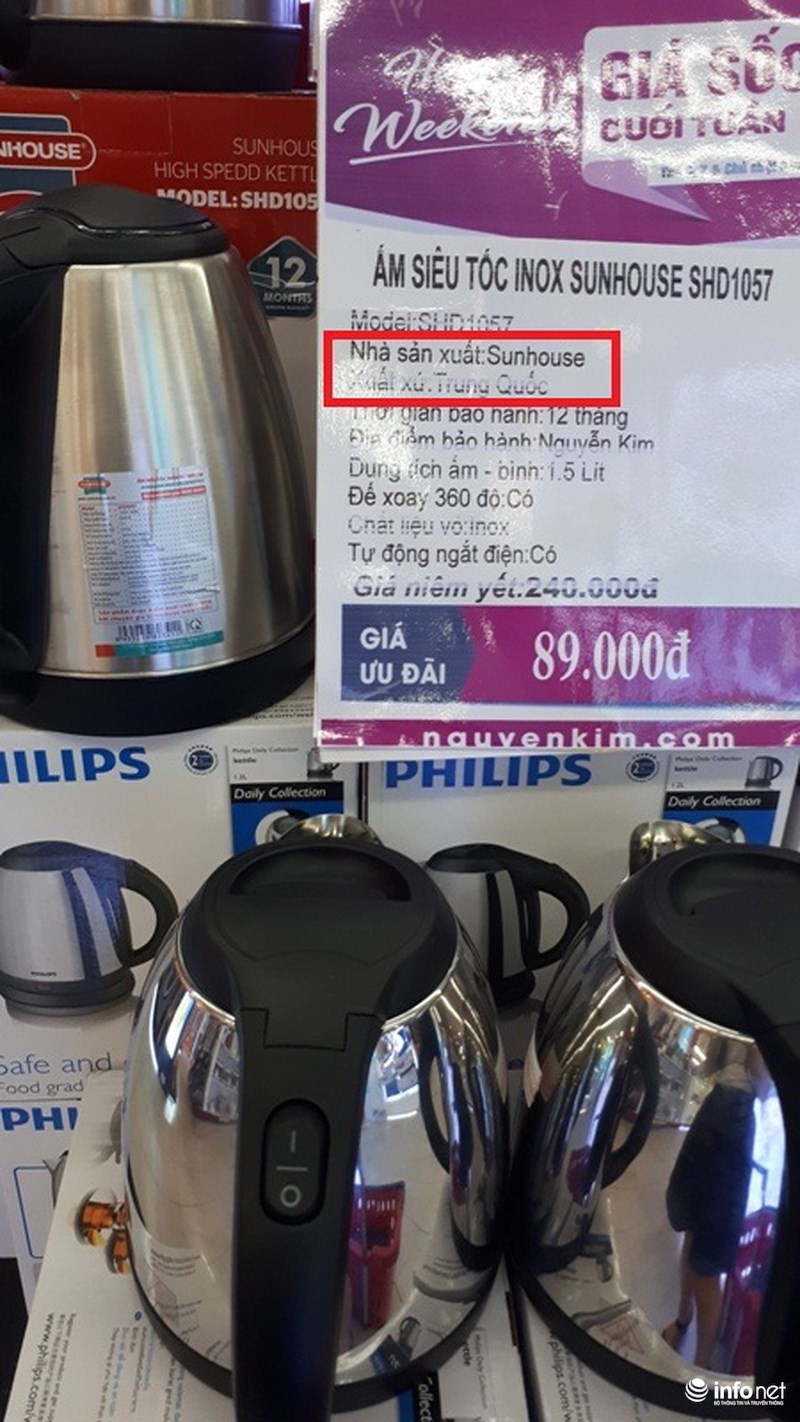 Chiếc ấm siêu tốc được giới thiệu nhà sản xuất là Sunhouse có xuất xứ từ Trung Quốc... Ảnh: Minh Thư