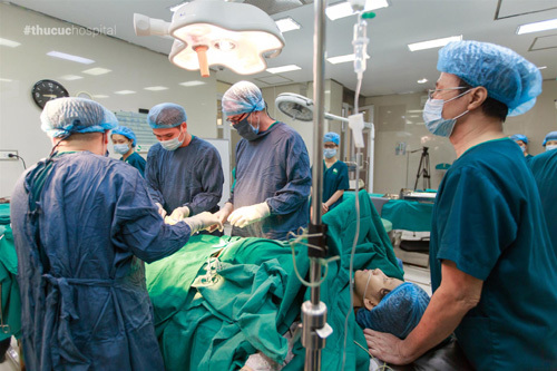 | Trong lúc các cô hộ sinh chăm sóc cho con thì các bác sĩ tiếp tục thực hiện loại bỏ khối u cho mẹ |