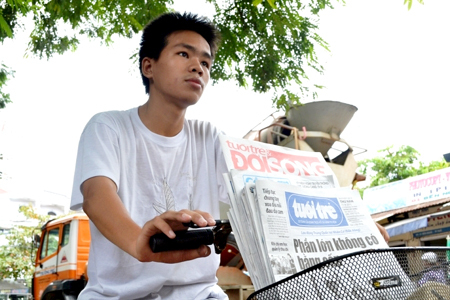 | Với chiếc xe đạp cọc cạch, hàng ngày Huy vẫn đều đặn giúp mẹ bán báo |