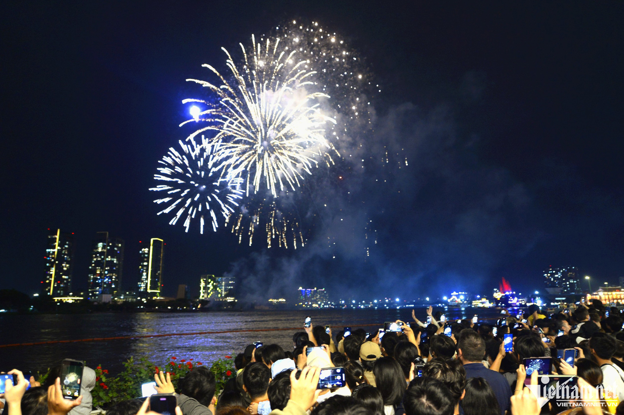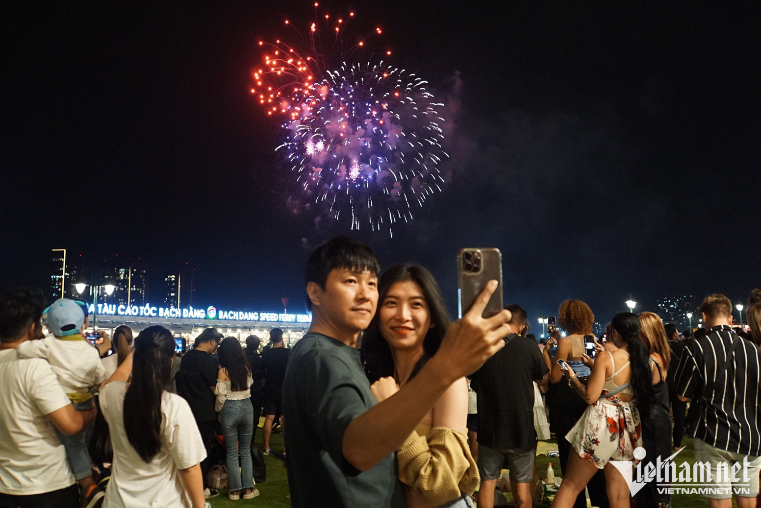 Cùng thời điểm này tại hai bên bờ sông Sài Gòn, hàng chục nghìn người dân TP.HCM cũng được chứng kiến 15 phút pháo hoa mãn nhãn. Ảnh: Thế Sơn.