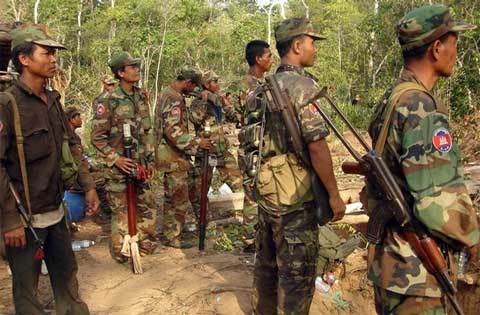 Binh sĩ có vũ trang của Campuchia ở tỉnh Oddar Meanchey - Campuchia tại biên giới Campuchia - Thái Lan (Ảnh EPA)