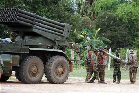 Binh sĩ Campuchia và bệ phóng rocket BM-21 tại tỉnh Oddar Meanchey, gần biên giới Thái hôm 26/4. (Ảnh Reuters)