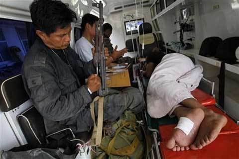 Binh sĩ Thái bị thương được đưa tới viện ở tỉnh Surin. (Ảnh Reuters)