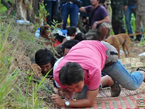 Lực lượng an ninh tình nguyện và nhà báo Thái cúi người để tránh bị dính lựu đạn khi xung đột giữa Thái Lan và Campuchia vẫn đang tiếp diễn ở gần đền Ta Mouan Thom (Ảnh Nation)