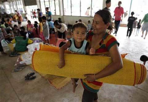 Dân làng Thái ở một nơi trú ẩn tại tỉnh Si Sa Ket sau khi rời khu vực gần ngôi đền Preah Vihear. (Ảnh Reuters)