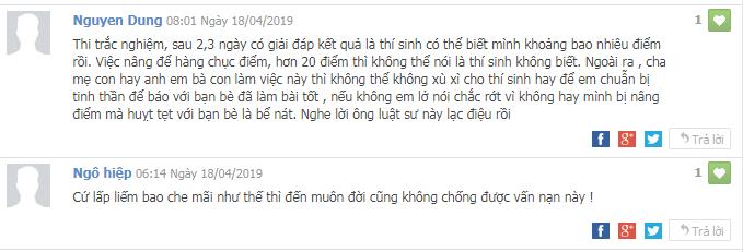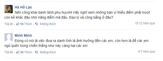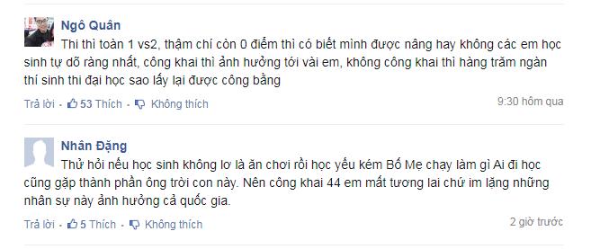 Không những vậy, có ý kiến còn cho rằng bài thi rất nhiều điểm 1, 2 được nâng lên 9, 10 thì thí sinh có khi còn là người đề nghị bố mẹ 'mua' điểm cho mình. Do đó, luồng ý kiến này cho rằng nên công khai danh tính các thí sinh này bởi các thí sinh này đã đủ tuổi và ý thức được việc làm của mình, đồng thời việc không công khai danh tính chỉ giúp bảo vệ được danh dự vài chục học sinh nhưng sẽ không bao giờ chống lại được vấn nạn gian lận trong thi cử.
