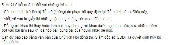 Theo khoản 5, điều 49, chương 10 của 'Thông tư Ban hành quy chế thi Trung học Phổ thông và xét công nhận tốt nghiệp Trung học phổ thông' thì tất cả các trường hợp để người khác thi thay hoặc làm bài thay cho người khác dưới mọi hình thức; sửa chữa, thêm bớt vào bài làm sau khi đã nộp bài; dùng bài của người khác để nộp đều sẽ bị hủy bỏ kết quả thi.