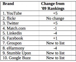 2010 được xem là năm của các dịch vụ chia sẻ video và hình ảnh. Đó là lý do giải thích cho sự vươn lên của Youtube và Flickr, cũng như sự rớt hạng của một vài mạng xã hội khác.