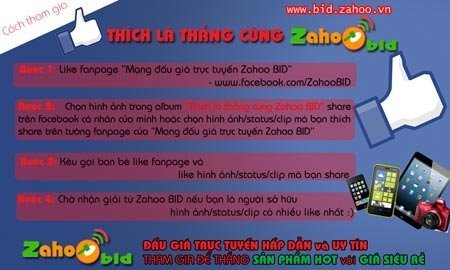 Bên cạnh đó, người dùng còn có thể kiếm thêm các gói Bid giá trị làm vốn tích luỹ bằng cách tham gia fanpage “Mạng đấu giá trực tuyến Zahoo BID” trên facebook và chia sẻ hình ảnh hay câu nói mình yêu thích. Người sở hữu lượt LIKE nhiều nhất sẽ là người chiến thắng.