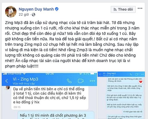 Tuy nhiên, theo đoạn chat được ca sĩ Duy Mạnh tải lên trang cá nhân, phía Zing MP3 chỉ đồng ý mức 1 tỷ đồng, kèm với chia sẻ doanh thu trên bài hát. Ca sĩ không đồng ý mức này.